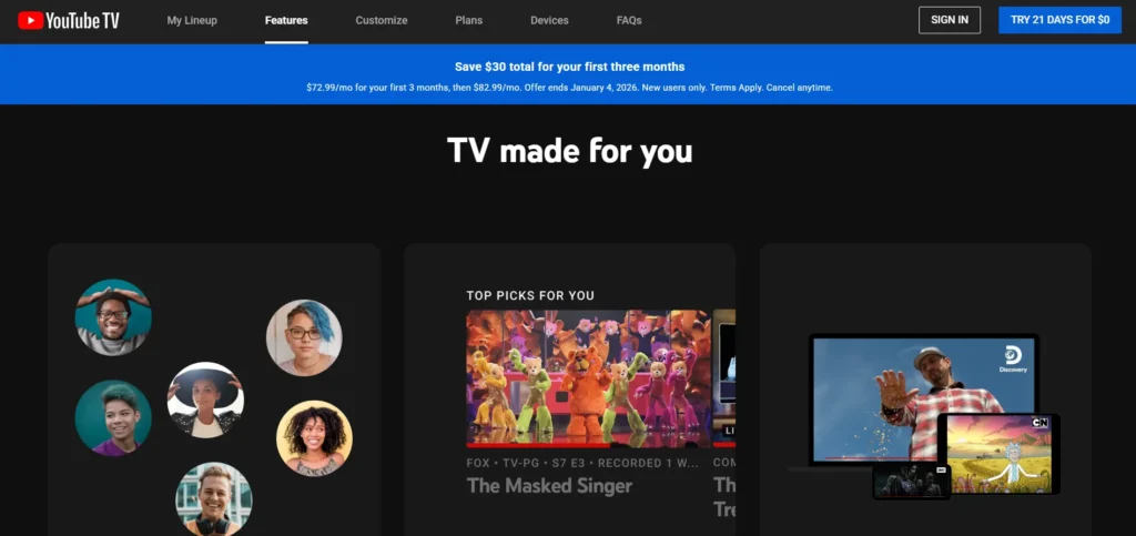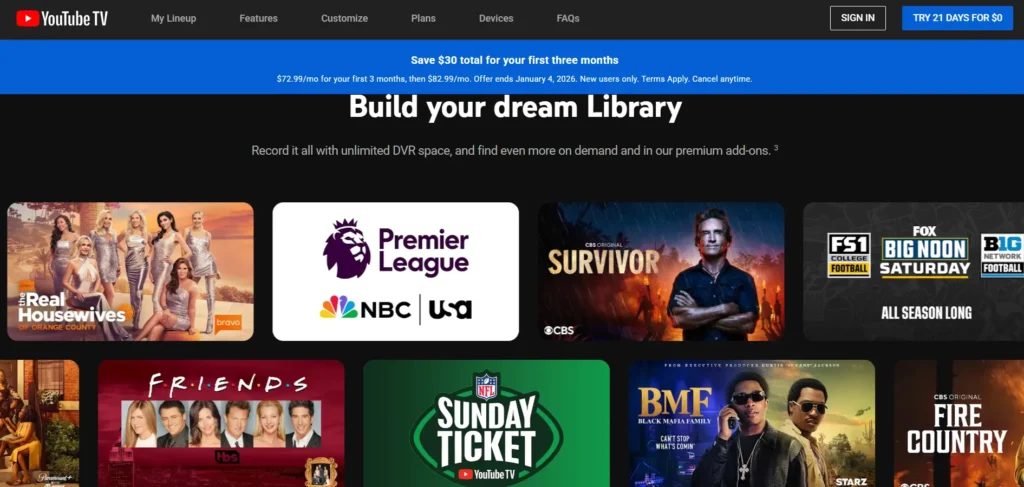 The service includes features like unlimited cloud DVR storage, allowing users to record shows and watch them later, as well as the option to stream on multiple devices.