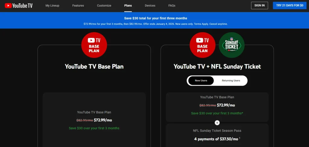 | YouTube TV | $82.99 / month | Sports Plus ($10.99), 4K Upgrade ($19.99) | 7-day trial |